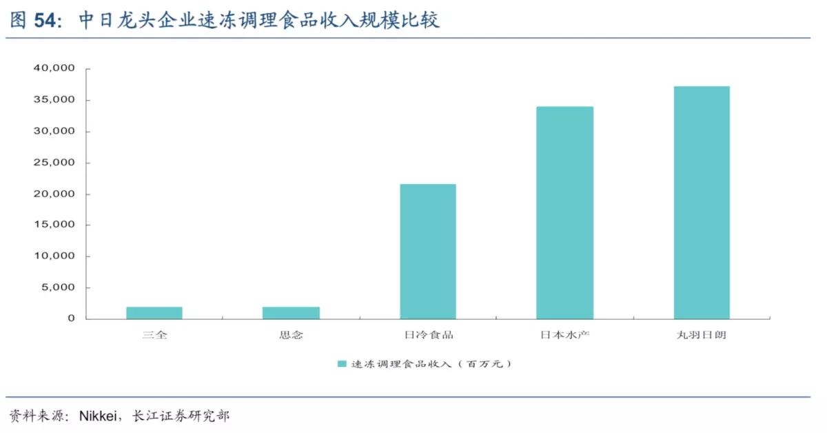 除了家庭用的渠道外,餐飲渠道也是速凍食品的重要通路。事實(shí)上從行業(yè)相對發(fā)達(dá)的日本的經(jīng)驗(yàn)看,餐飲渠道是消化速凍食品產(chǎn)能的主力:1)從數(shù)量看,17 年日本速凍行業(yè) 160 萬噸的銷售量中,41%是家庭用(家庭需求),59%是業(yè)務(wù)用(餐飲等需求);2)從金額看,7180 億元的銷售金額中,42%是家庭用,58%是業(yè)務(wù)用。如果以日本為參照系,那么速凍行業(yè)在家庭和餐飲渠道的占比結(jié)構(gòu)應(yīng)為 2:3,餐飲等食品服務(wù)渠道是速凍食品主要的銷售通路。