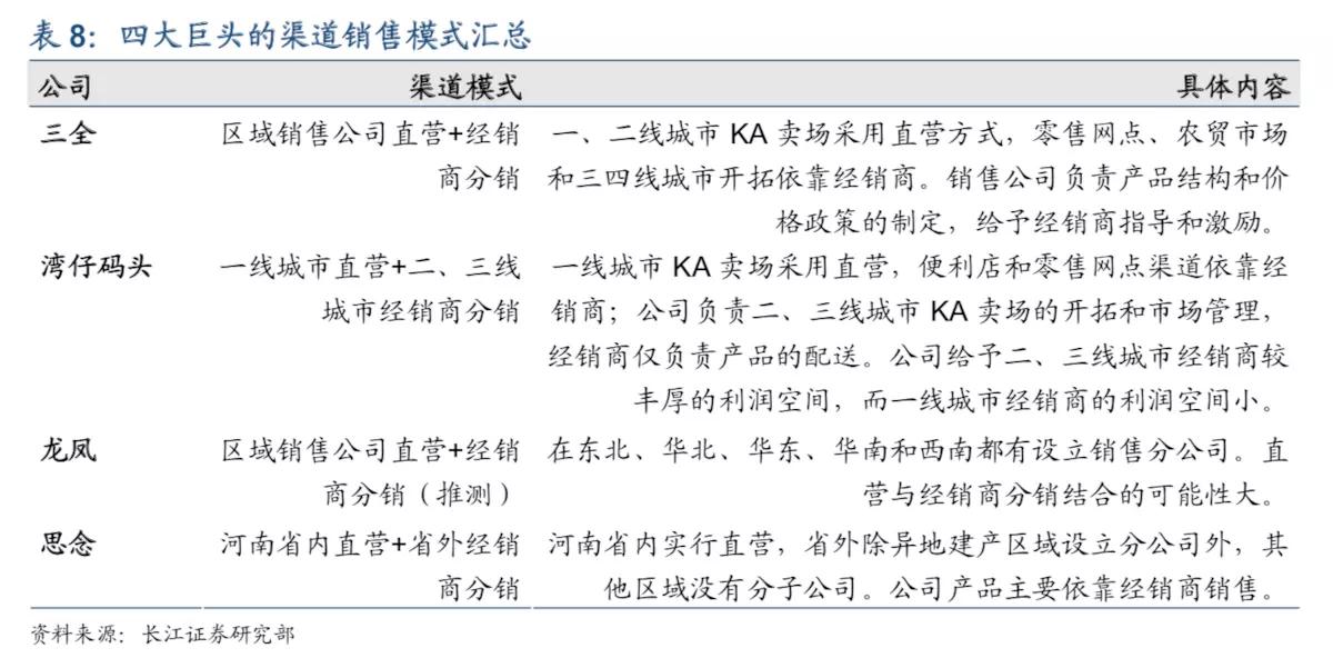 速凍食品企業(yè)的銷售模式分公司直營和經(jīng)銷商分銷兩類。行業(yè)龍頭企業(yè)間的渠道模式選擇的側(cè)重點(diǎn)有所不同,三全、灣仔碼頭和龍鳳以區(qū)域銷售公司直營為主,而思念主要依靠經(jīng)銷商銷售。