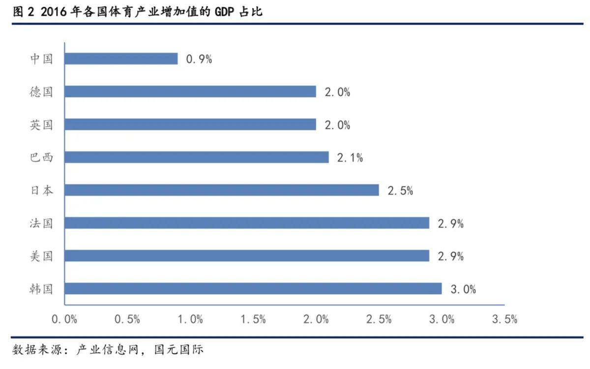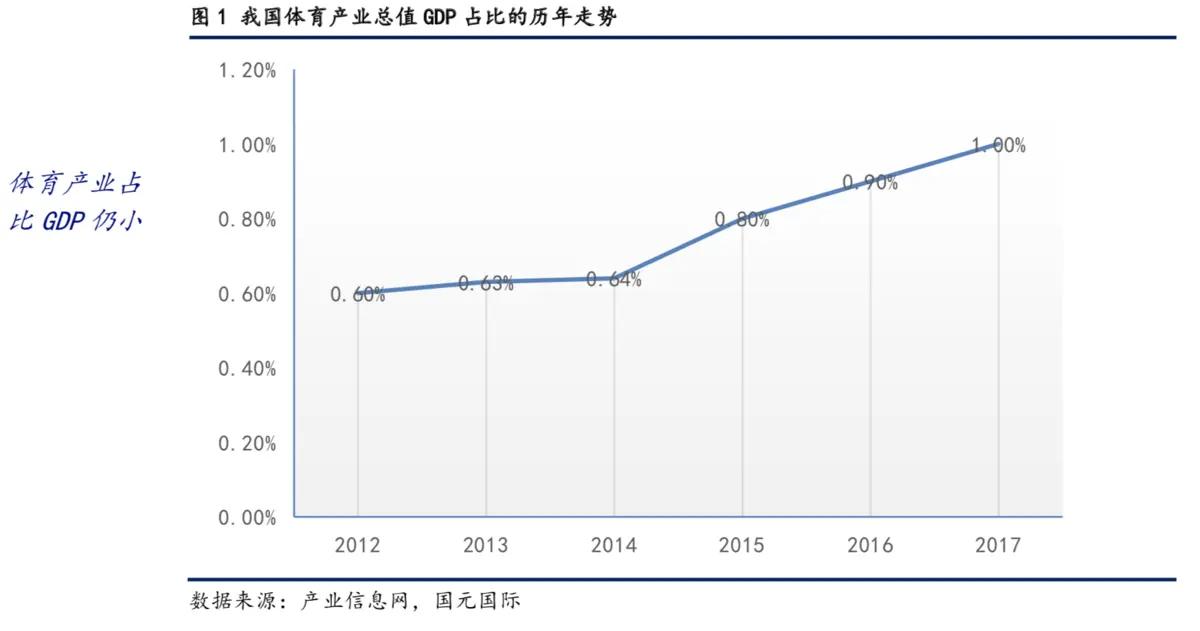 我國體育產(chǎn)業(yè)較發(fā)達國家起步較晚,目前占比 GDP 的份額仍然距離其他發(fā)達國家有相當?shù)牟罹?,但近年來產(chǎn)業(yè)發(fā)展很快,領域也在迅速拓寬,規(guī)模也在不斷壯大,總體上仍然處于快速發(fā)展階段。