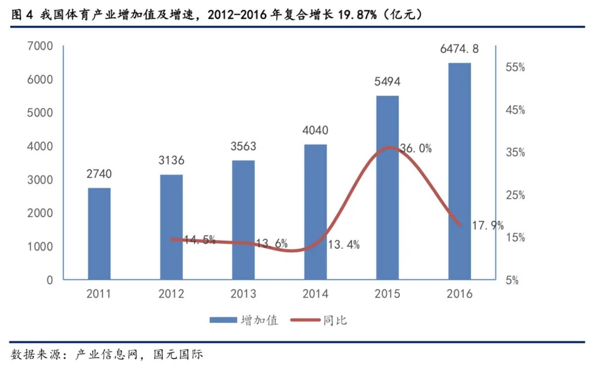 2016 年國家體育產(chǎn)業(yè)總規(guī)模為 1.9 萬億元,增加值為 6474.8 億元,占同期國內(nèi)生產(chǎn)總值的比重為 0.9%,這一比重雖然也是逐年上升,2012 年時占比為 0.6%,但仍舊遠遠低于世界發(fā)達水平。