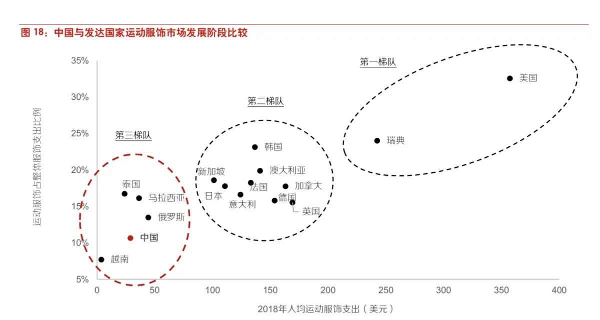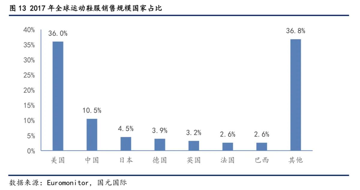 美國仍是全球運動鞋服最大市場,2017 年占比達 36%;中國緊隨其后,占比約為 10.5%,我國人數(shù)遠遠超過美國,因此體育板塊的消費還是處于發(fā)展階段,遠未達到成熟階段。