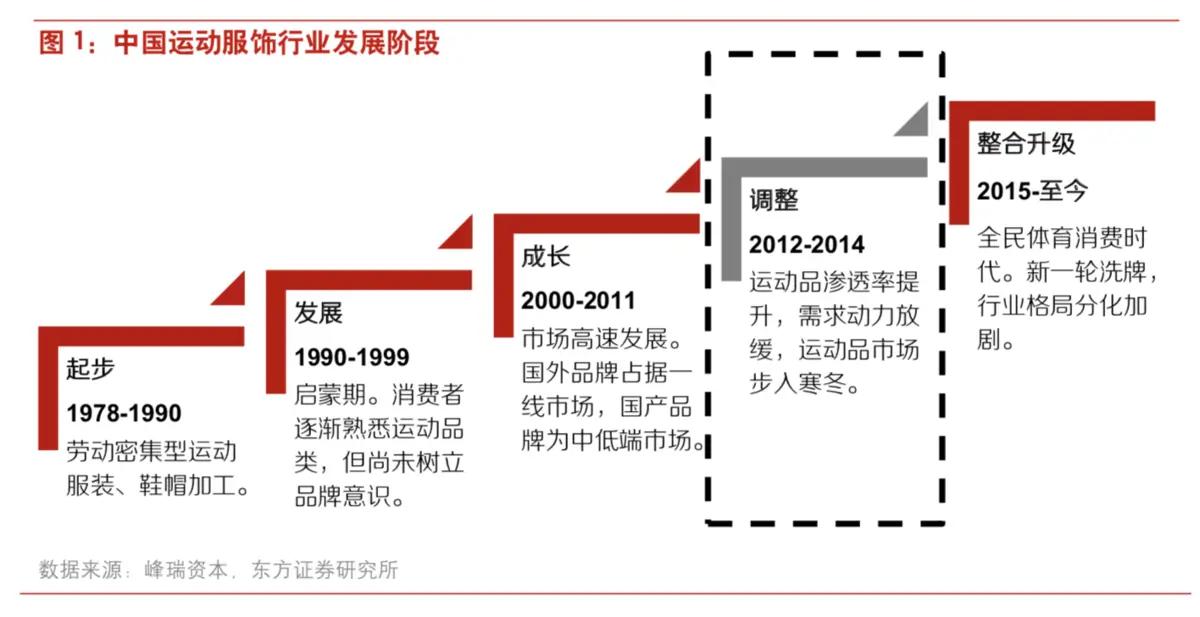 中國的運動服飾行業(yè)從 1978 年起可分為五個發(fā)展階段,分別為起步階段(1978-1990 年)、發(fā)展階段(1990-1999 年)、成長階段(2000-2011 年)、調(diào)整階段(2012-2014 年)和整合升級階段(2015 年至今)。