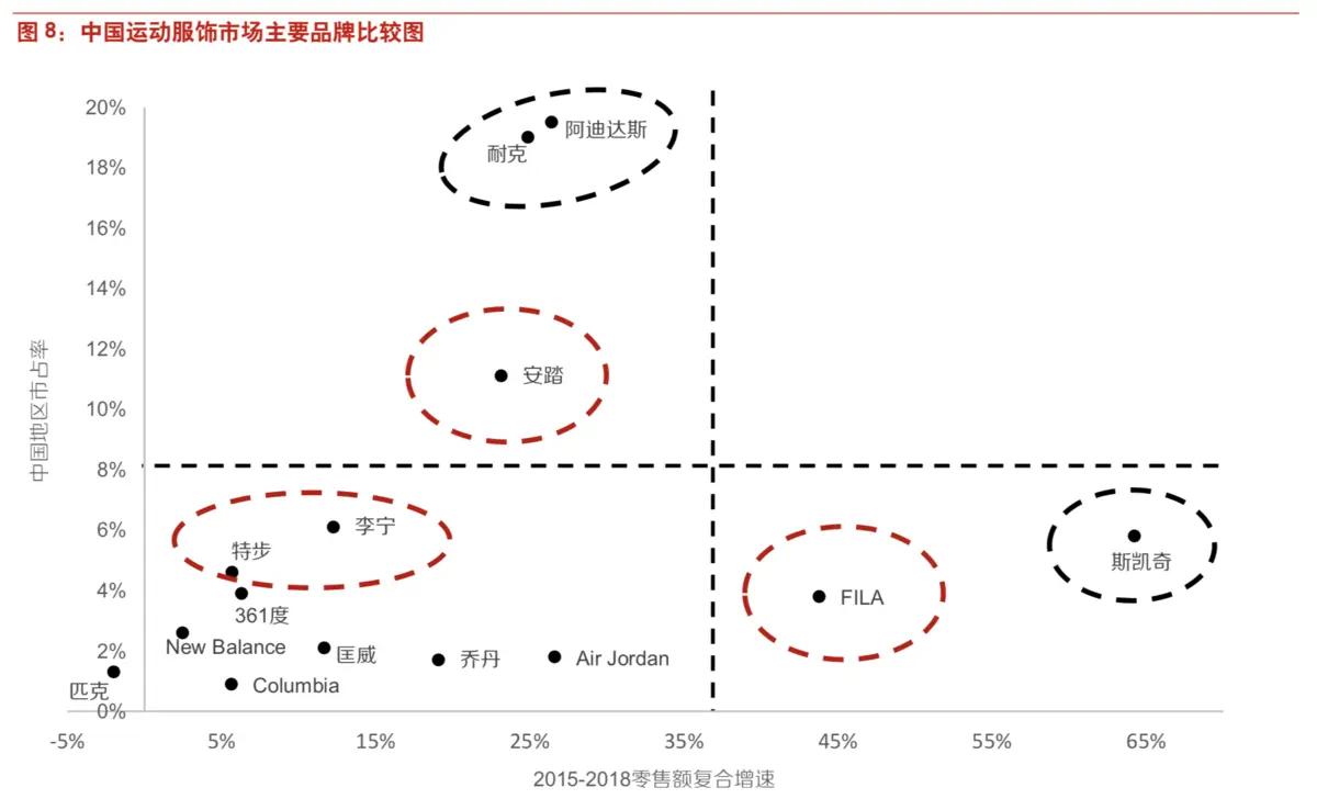 2015 到 2018 年間,阿迪達斯的國內(nèi)市占率提升了 4.2%,耐克的市占率提升了 3.6%,斯凱奇的市占率提升了 3.7%,國內(nèi)龍頭安踏提升了 3.4%,李寧和特步小幅下滑。
