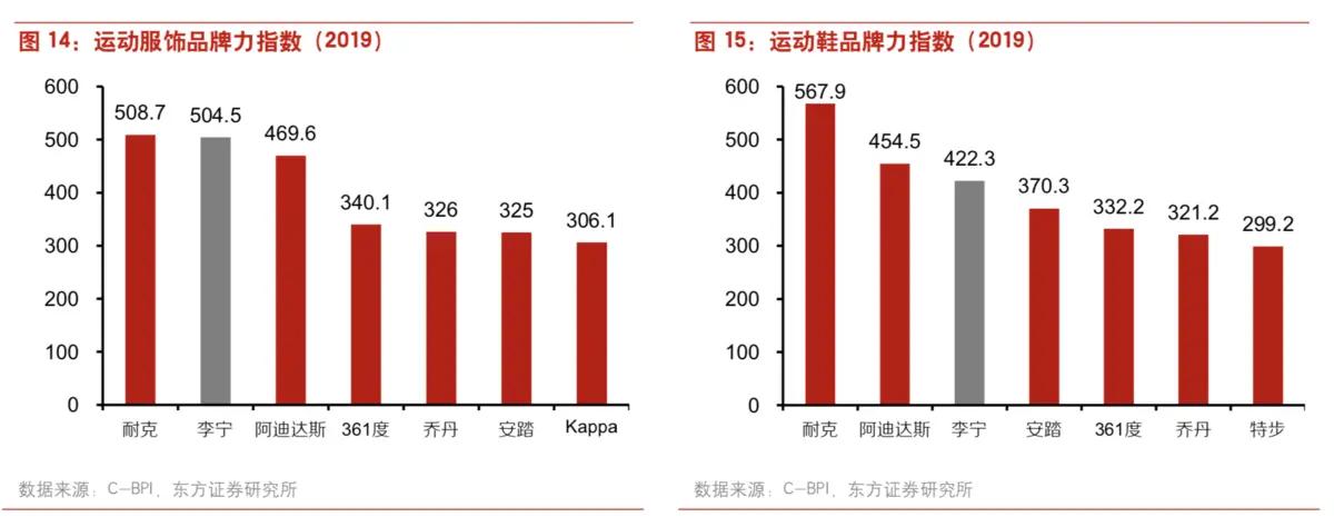 通過分析 C-BPI 的統(tǒng)計數(shù)據(jù)也能得到類似的結(jié)論,2019 年,李寧在運動服飾品類中的品牌力已超越阿迪達斯,位居國內(nèi)第 2,僅次于耐克;運動鞋方面,李寧位居國內(nèi)第 3,僅次于耐克和阿迪達斯,在運動服飾、運動鞋這兩項主營業(yè)務上,李寧品牌力的得分大幅領先安踏、361 度、特步等本土品牌,表明李寧具有深厚的品牌力基礎。
