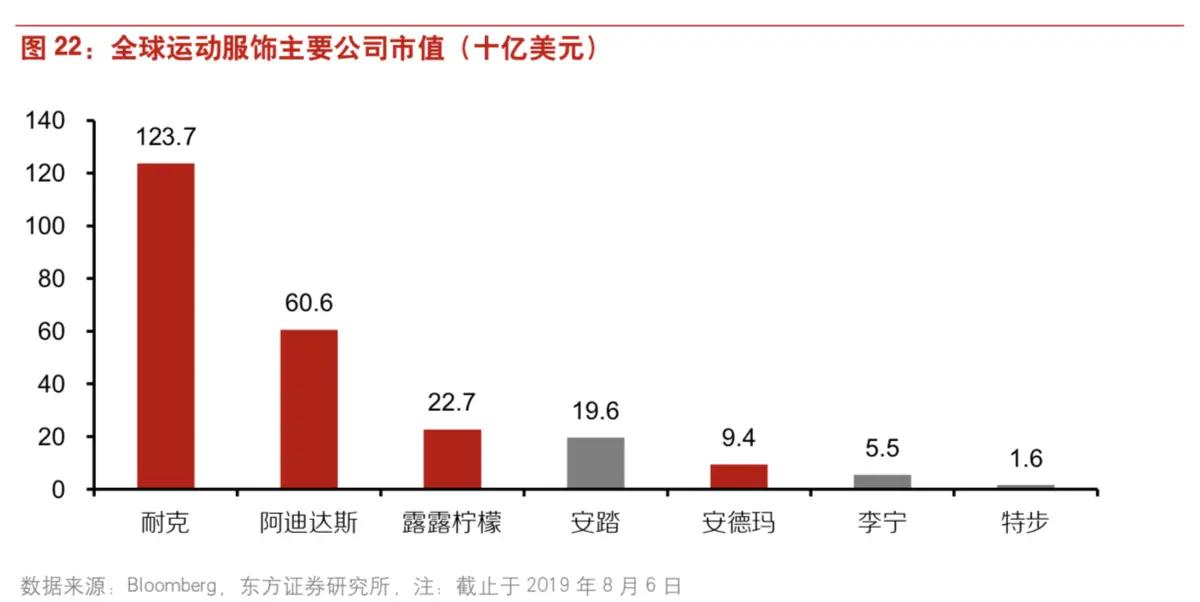 我們認為運動服飾行業(yè)未來仍然是服飾行業(yè)的最佳賽道之一,潛力巨大。未來五年行業(yè)的復合增速將超過 10%,僅次于童裝行業(yè)的 13%,大幅領先于其他服飾子行業(yè)。從國際經(jīng)驗看,運動服飾領域容易誕生大市值公司,根據(jù) 2019 年 8 月 6 日最新市值數(shù)據(jù),耐克、阿迪達斯和露露檸檬是目前全球運動服飾行業(yè)中市值最大的三家公司,市值分別為 1,237億、606 億和 227 億美元,本土第一品牌安踏排名第四,市值為 196 億美元,不到耐克的六分之一,李寧和特步則更小。