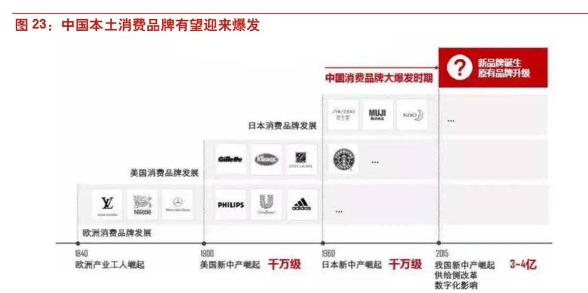從歷史經(jīng)驗來看,每一次中產(chǎn)的崛起,必會帶來本土品牌的大規(guī)模發(fā)展。根據(jù)阿里研究院的研究成果,早在 1984 年,歐洲產(chǎn)業(yè)工人的崛起,締造了一批百年品牌如 LV、雀巢和奔馳等,1900 年美國千萬級新中產(chǎn)的崛起,帶來了吉列、飛利浦、聯(lián)合利華等知名品牌,最近一次的 1960 年日本千萬級中產(chǎn)崛起,同樣帶來了一批優(yōu)秀的日本本土品牌例如資生堂、無印良品、花王等。2015 年起中國預計有 3-4 億規(guī)模級別的新中產(chǎn)將崛起,疊加供給側(cè)改革和數(shù)字化的影響,未來中國本土品牌發(fā)展的想象空間巨大。