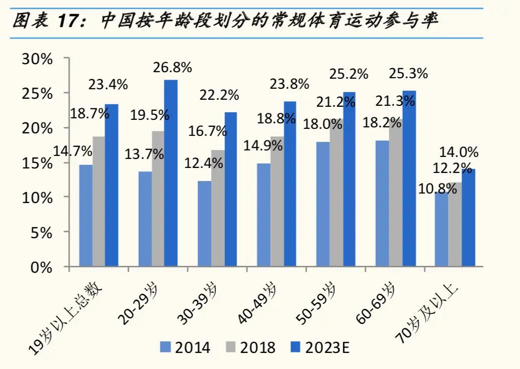 常規(guī)體育運動參與率:未來 5 年有望由 18.7%提升至 23.4%。隨著國人對運動帶來 的健康益 處的認 知加深 ,以及 城市化進程使越來越多的中國人口能夠使用 優(yōu)質(zhì)的體 育設施 ,受經(jīng) 濟條件 和有限的 產(chǎn)品供 給而抑 制的體育運動參與度將顯著增加。根據(jù) Frost&Sullivian 數(shù)據(jù),我國全民的體育運動參與率由 2014 年的 14.7%增長至 2018 年的 18.7%,且各年齡段的參與率都在增加,但與美國 35.9%的參與率數(shù)據(jù)相比仍具有較大差距,預計 2023年我國全民的體育運動參與率有望進一步增長至 23.4%。