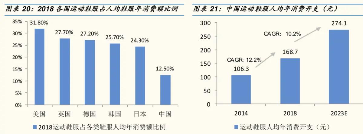 人均運 動鞋服支出:未 來 5 年有 望維持 10.2%的 復合增速。 根據(jù)Frost&Sullivian 數(shù)據(jù),2018 年,就運動鞋服的人均年消費額占各類鞋服的人均年消費額的百分比而言,英國為 27.7%,美國為 31.8%,日本為24.3%,韓國為25.7%,德國為 27.2%,而中國僅為 12.5%,在運動鞋服方面的人 均年消費 支出仍 落后其 他主要 發(fā)達經(jīng)濟體。在 國家經(jīng) 濟發(fā)展 到較高水平之 后,消費 者在體 育運動 方面的 相關(guān)花費 更多, 預計我 國運動鞋服的人均年消費額將在 2023 年增長到 274.1 元。