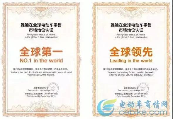 雅迪推出新的企業(yè)品牌口號“全球銷量遙遙領(lǐng)先”,業(yè)內(nèi)頭部信息咨詢公司歐睿國際在現(xiàn)場為雅迪頒發(fā)了“全球第一”和“全球領(lǐng)先”的證書。據(jù)了解,2018年雅迪年銷量突破503萬輛、全球用戶高達(dá)3000萬、門店數(shù)量突破20750家,出口全球77個國家和地區(qū)。