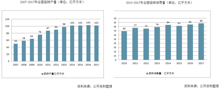 我國陶瓷行業(yè)發(fā)展迅速,產(chǎn)能持續(xù)擴(kuò)張,2017 年,我國瓷磚產(chǎn)量 101.5 億平,同比下降1.15%;全國瓷磚消費(fèi)量 88.1 億平,同比增長 4.01%。城鎮(zhèn)化率不斷提升,疊加生育高峰人口進(jìn)入主流消費(fèi)期,同時(shí)新房、二手房翻修支持建陶行業(yè)需求。