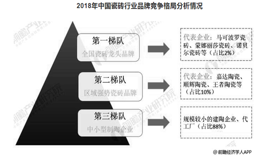 現(xiàn)階段,國內(nèi)瓷磚行業(yè)整體形成三個(gè)梯隊(duì)的競(jìng)爭(zhēng)格局。第一梯隊(duì)全國瓷磚龍頭品牌,約30家,占總企業(yè)數(shù)的2%,他們具備很強(qiáng)的市場(chǎng)競(jìng)爭(zhēng)能力,重點(diǎn)定位于中高端瓷磚市場(chǎng)的高品質(zhì)瓷磚企業(yè)。第二梯隊(duì)為區(qū)域強(qiáng)勢(shì)瓷磚品牌,約200家,占企業(yè)數(shù)的10%;第三梯隊(duì)中小型制陶企業(yè),約1700余家,占企業(yè)數(shù)的88%,主要是規(guī)模較小的企業(yè)和代工廠,相當(dāng)一部分企業(yè)技術(shù)落后、自主品牌和渠道缺乏,市場(chǎng)競(jìng)爭(zhēng)力差,這部分企業(yè)最容易在激烈的市場(chǎng)競(jìng)爭(zhēng)中走向淘汰。