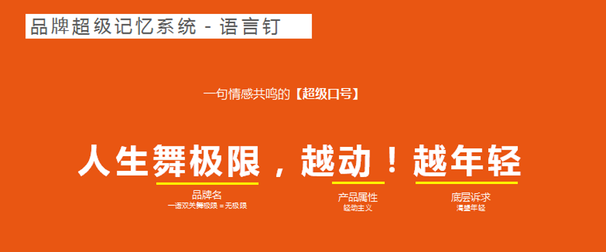 舞極限品牌記憶系統(tǒng)=品牌名 +超級符號+超級色彩+語言釘+視覺錘畫面+超級代言人