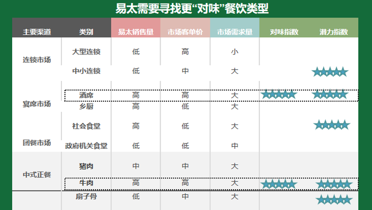 客戶需要尋找更適合自身品牌的餐飲產(chǎn)品類型,我們將易太現(xiàn)有所有供應的餐飲產(chǎn)品類型進行梳理后,專門篩選整合對比,通過市場客單價,市場需求量和易太銷售量三者去進行“對味指數(shù)”,找出更符合品牌調(diào)性產(chǎn)品并提出餐飲渠道偏移方面的意見。
