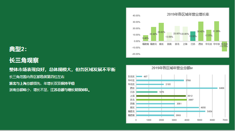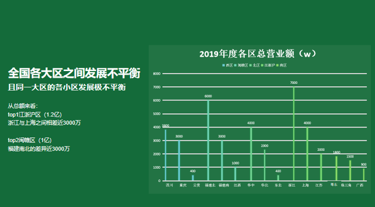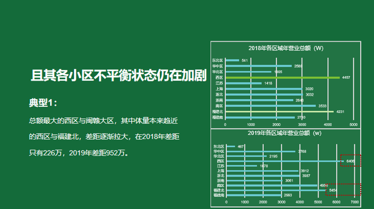 通過調(diào)查我們發(fā)現(xiàn)“全國各大區(qū)市場發(fā)展不平衡”這一問題,我們通過統(tǒng)一大區(qū)的各小區(qū)發(fā)展情況,并且觀察這種不平衡狀態(tài)的程度。并且為了更形象地體現(xiàn)出這種差距,我們將“長三角”和“珠三角”,進行對比分析,發(fā)現(xiàn)差距將近“1億元”。這樣就很直觀地說明了“區(qū)域差異的程度”。