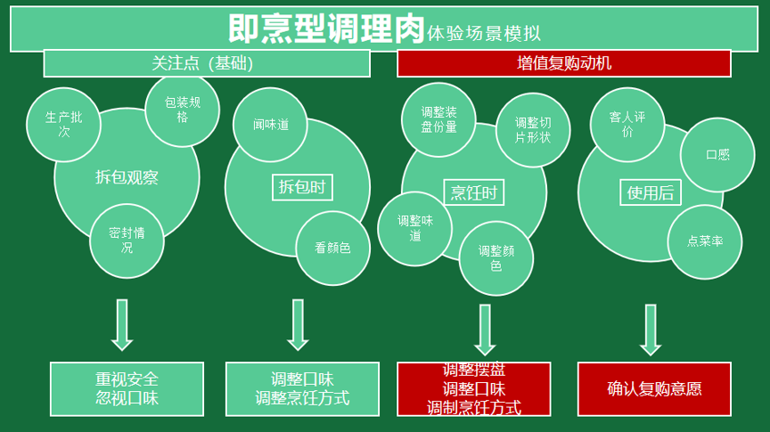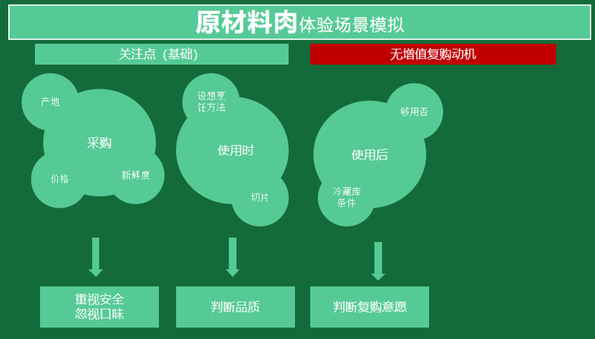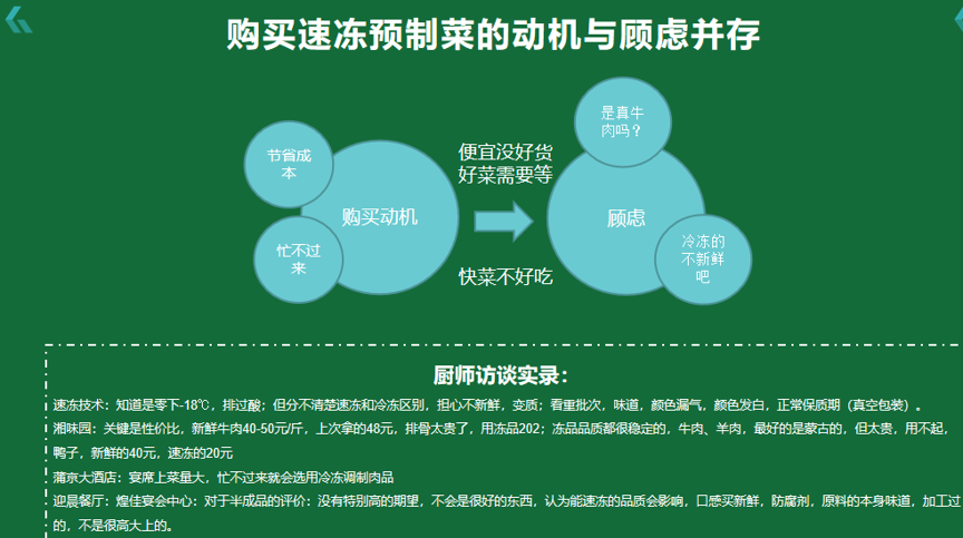 那么到底是什么因素對廚師說服力最強?我們深入到消費者行為中,試圖探究“原料肉”,“速凍預制”“成品”這三種購買消費行為的不同,以探知速凍菜肴的真正痛點,我們發(fā)現(xiàn)“速凍預制菜肴”的購買動機與顧慮都同時存在。