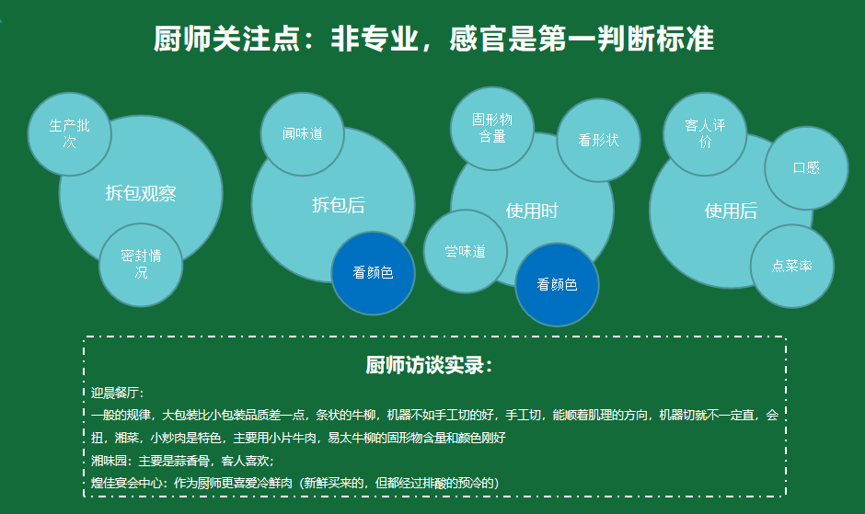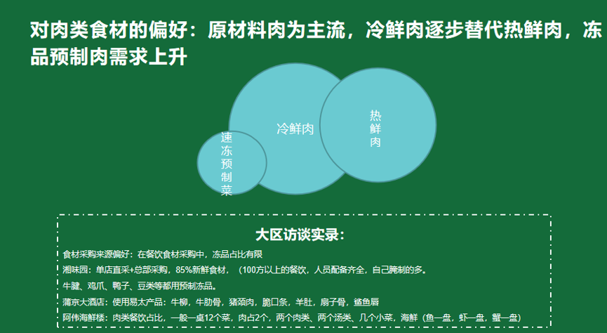 而廚師的關(guān)注點,更多的是通過感官去進行感知。而對于肉類食材的偏好方面:“原料肉為主流,冷鮮肉逐步替代熱鮮肉,凍品預制肉需求上升?!?span>