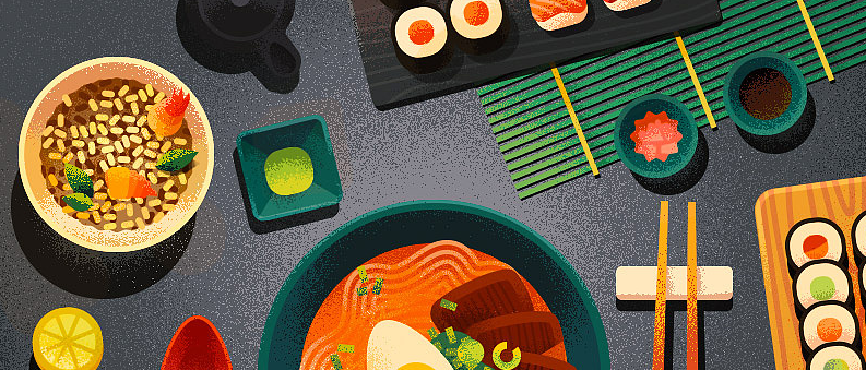 肌理插畫(huà)——色彩和飽和度高,畫(huà)面輕快,用扁平化方式處理。這種畫(huà)法通常加入雜色,增加顆粒感,通過(guò)明暗色塊區(qū)分元素,增加立體感。